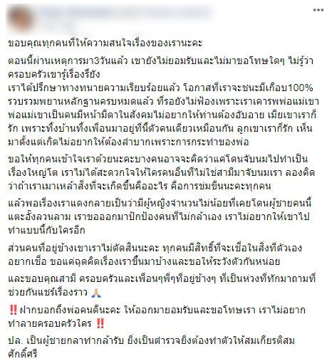 ทั้งนี้ เจ้าของโพสต์ได้ปรึกษาทนายแล้ว พร้อมรวบรวมหลักฐานเตรียมดำเนินคดี แต่ติดว่าเกรงใจพ่อแม่ ภรรยา และลูกของคู่กรณี