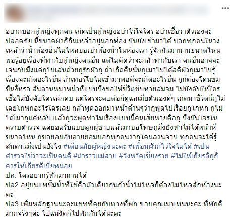 เกิดเป็นหญิงอย่าไว้ใจใครแม้กระทั่งเพื่อนสามี หญิงสาวรายหนึ่งโพสต์เฟซบุ๊กเล่าเรื่องแฉพฤติกรรมเพื่อนสามี สำคัญคือเป็นตำรวจ โดยเขาพยายามเข้ามาข่มขืนเธอแต่ไม่สำเร็จ พอถูกจับได้ก็อ้างมาขอเข้าห้องน้ำ พร้อมกล่าวหาผู้หญิงว่าแต่งเรื่องโกหก เจ้าของโพสต์แฉ เพื่อนสามีทำพฤติกรรมเช่นนี้กับหลายคนแล้ว ทำตัวเป็นโจรในคราบตำรวจ เบื้องต้นปรึกษาทนายแล้วแต่ยังไม่แจ้งความเพราะเกรใจครอบครัวฝ่ายนั้น