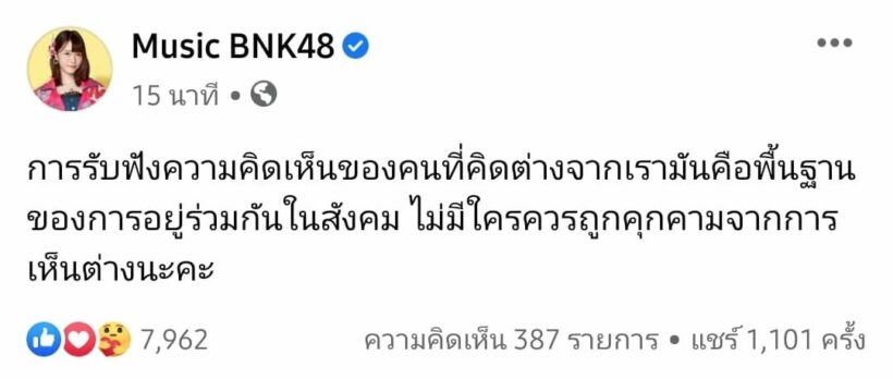 มิวสิค BNK48 ขอพูด ไม่ควรมีใครถูกคุกคามเพราะเห็นต่าง
