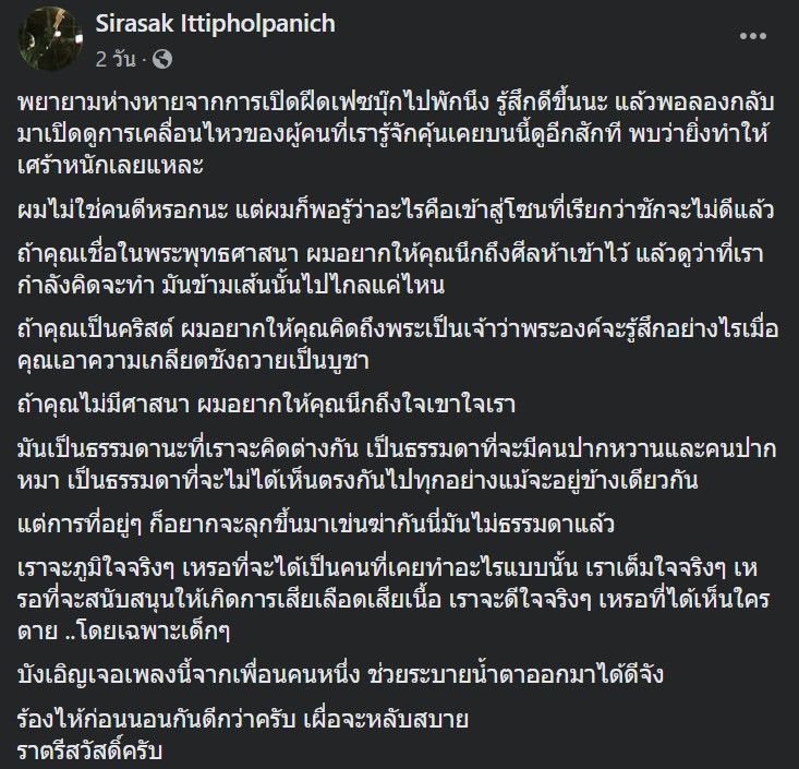 ต่อมาปิงปองก็ได้โพสต์ข้อความอีกว่า “ในช่วงเวลาแบบนี้ พยายามรักษาศีลธรรมและความเป็นคนกันไว้นะครับ ลูกหลานเราคงไม่ภูมิใจหรอกที่มีพ่อแม่ลุงป้าเป็นฆาตกรอะ”