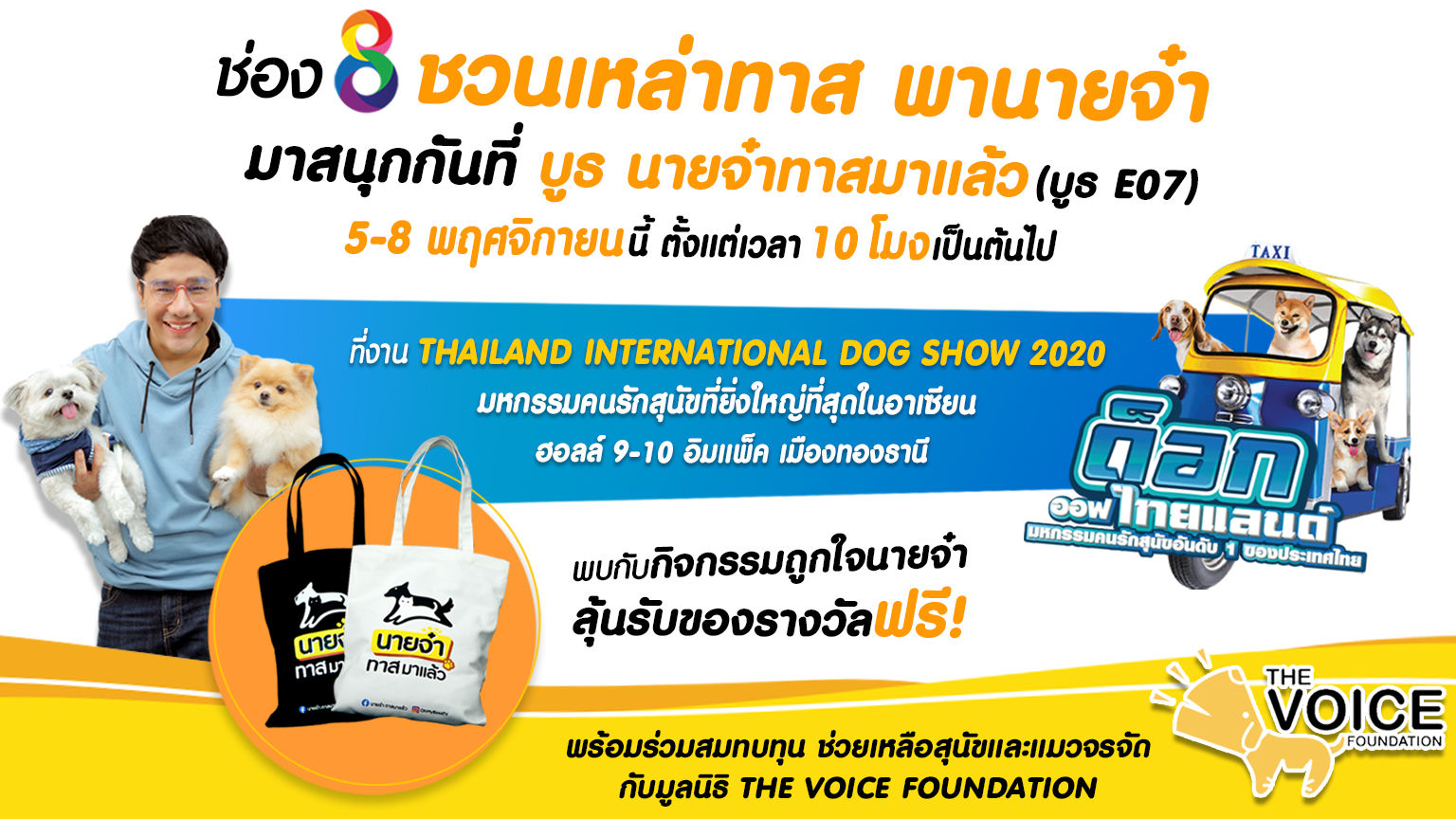 “ผมก็ดูแลหมาจรจัดมาหลายปีแล้วครับ ที่บ้านมีหมาอยู่ประมาณ 10 ตัว ก็เป็นหมาจรจัดที่ผมเก็บมาเลี้ยงไว้ประมาณ 8 ตัว ซึ่งเป็นหมาที่ถูกทอดทิ้งไว้ตามตึกตามคอนโดต่างๆ และอยู่ในป่า มีบางตัวเคยเป็นหมาขี้เรื้อนผมก็นำมารักษาจนหายดี ยังมีหมาที่ถูกทอดทิ้งอีกเป็นจำนวนมากมายไม่ได้รับการดูแล ผมก็เลยอยากเชิญชวนผู้ใจบุญทั้งหลายร่วมกันซื้อถุงผ้า “นายจ๋าทาสมาแล้ว” รุ่นลิมิเตด ทำมาจำนวนจำนวนจำกัดแค่ 80 ใบเท่านั้น ราคาใบละ 250 บาท รายได้หลังหักค่าใช้จ่ายก็จะนำไปบริจาคให้กับ มูลนิธิ The Voice เสียงจากเรา ของคุณเก๋ ชลลดา เมฆราตรี นางฟ้าของหมาจรทั้งหลาย โดยสามารถไปจองซื้อได้ที่บูธ E07 ในงาน” Thailand International Dog Show 2020” ตั้งแต่วันที่ 5-8 พฤศจิกายน 2563 ฮอล์ล 9-10 อิมแพค เมืองทองธานี ครับ พร้อมเจอกับผมได้ในงานนะครับ ขอบคุณครับ”