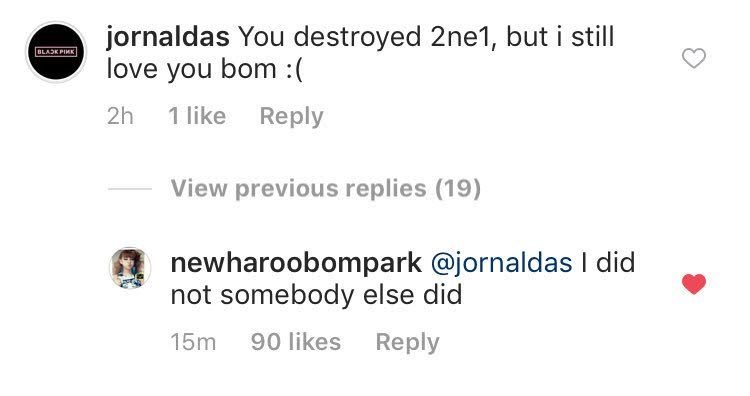และหนึ่งในผู้ที่เกลียดชังแสดงความคิดเห็นในโพสต์อินสตาแกรมส่วนตัวของเธอว่า “เธอ ‘ทำลาย’ 2NE1”