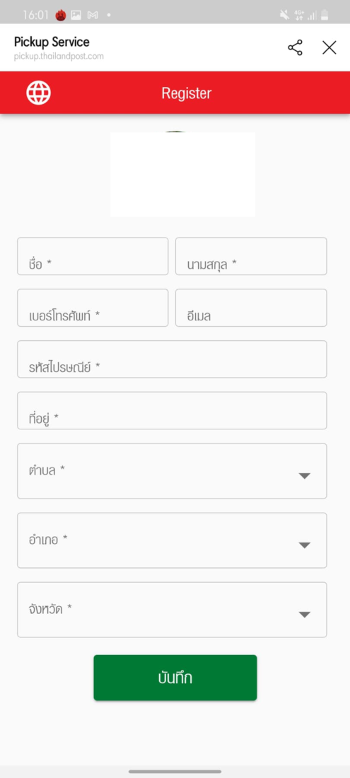 จากนั้นให้กรอกข้อมูล ชื่อ ที่อยู่ เบอร์โทรศัพท์ ระบุวัน เวลา จำนวนพัศดุที่จะให้ไปรษณีย์มารับ (ล่วงหน้าอย่างน้อย 1 วัน)