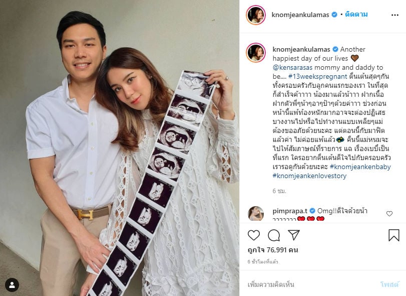 “Another happiest day of our lives @kensarasas mommy and daddy to be… #13weekspregnant ตื่นเต้นสุดๆ กันทั้งครอบครัวกับลูกคนแรกของเรา ในที่สุดก็สำเร็จค่าาาา น้องมาแล้วน้าาา ฝากเนื้อฝากตัวพี่ๆน้าๆอาๆป้าๆด้วยค่าาา ช่วงก่อนหน้านี้แพ้ท้องหนักมากอาจจะต้องปฏิเสธบางงานไปหรือไปทำงานแบบเพลียๆแม่ต้องขออภัยด้วยนะคะ แต่ตอนนี้กับมาฟิตแล้วค่า ไม่ค่อยแพ้แล้ว คืนนี้แม่หนมจะไปให้สัมภาษณ์ที่รายการ แฉ เรื่องเบบี๋เป็นที่แรก ใครอยากตื่นเต้นดีใจไปกับครอบครัวเรารอดูกันด้วยนะคะ #knomjeankenbaby #knomjeankenlovestory”