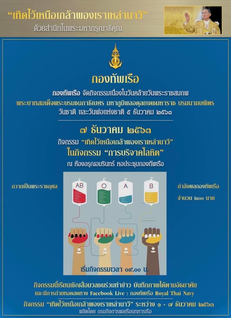 โดยกองทัพเรือ จะได้เข้าร่วมพิธีและกิจกรรมที่รัฐบาลได้จัดขึ้น อันได้แก่ พิธีถวายราชสักการะ พิธีทำบุญตักบาตรพระสงฆ์สามเณร และกิจกรรมบำเพ็ญสาธารณประโยชน์ทั้งในกรุงเทพมหานคร และภูมิภาคทุกพื้นที่ของกองทัพเรือ ตั้งแต่วันที่ ๑ ธ.ค.๖๓ ต่อเนื่องจนถึงวันที่ ๗ ธ.ค.๖๓ แล้ว ในการนี้ กองทัพรือได้จัดกิกรรม “เทิดไว้เหนือเกล้าผองเราเหล่านาวี” ร่วมกับการจัดงานของรัฐบาลด้วย