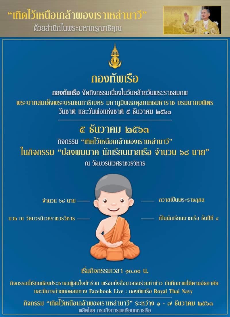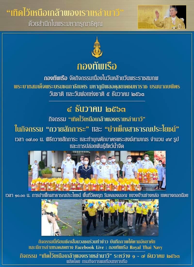 โดยกองทัพเรือ จะได้เข้าร่วมพิธีและกิจกรรมที่รัฐบาลได้จัดขึ้น อันได้แก่ พิธีถวายราชสักการะ พิธีทำบุญตักบาตรพระสงฆ์สามเณร และกิจกรรมบำเพ็ญสาธารณประโยชน์ทั้งในกรุงเทพมหานคร และภูมิภาคทุกพื้นที่ของกองทัพเรือ ตั้งแต่วันที่ ๑ ธ.ค.๖๓ ต่อเนื่องจนถึงวันที่ ๗ ธ.ค.๖๓ แล้ว ในการนี้ กองทัพรือได้จัดกิกรรม “เทิดไว้เหนือเกล้าผองเราเหล่านาวี” ร่วมกับการจัดงานของรัฐบาลด้วย