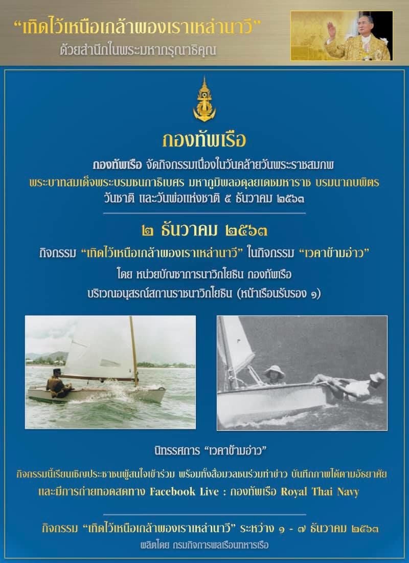 กองทัพเรือ จัดกิจกรรมเนื่องในวันคล้ายวันพระราชสมภพ พระบาทสมเด็จพระบรมชนกาธิเบศร มหาภูมิพลอดุลยเดชมหาราช บรมนาถบพิตร วันชาติ เเละวันพ่อแห่งชาติ ๕ ธันวาคม ๒๕๖๓ ในชื่อกิจกรรม “เทิดไว้เหนือเกล้าผองเราเหล่านาวี”