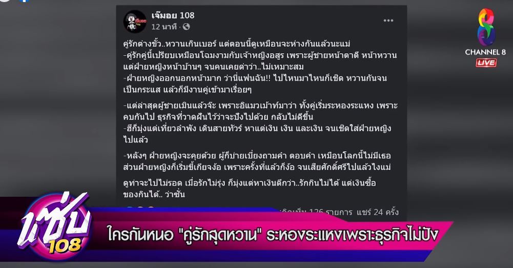 งานเข้าอีกคู่ เมื่อมีข่าวลืออักษรย่อ จากเพจดัง อย่างเจ๊มอย 108 ว่าเป็นคู่รักที่ความสัมพันธ์เริ่มสั่นคลอน หลังธุรกิจไม่ปัง มีการระหองระแหงกัน ไลน์ไปก็ไม่ตอบโทรไปก็ไม่รับสาย เมินไปเพราะมัวแต่ทำงานหาเงินอย่างเดียว พชร์ – เอิ๊ก พิธีกรปากกล้า จากรายการ “แซ่บ 108” ช่อง 8 เลยไม่รอช้า ออกมาฟัน “โช๊ะ โช๊ะ โช๊ะ” หลุดปาก เฉลยมาทันทีว่า คู่ที่ถูกเม้าท์นั้น ว่าคือใคร