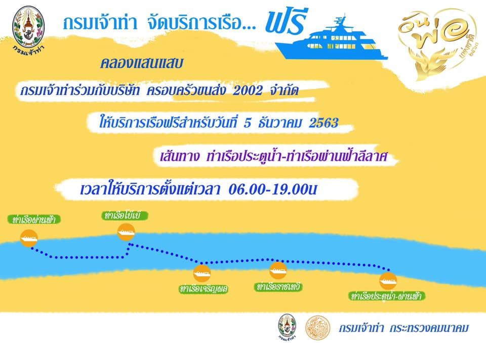 กรมเจ้าท่า จัดเปิดให้ใช้ บริการเรือ ฟรี เนื่องด้วย วันพ่อ เริ่มตั้งแต่ 1-6 ธ.ค.
