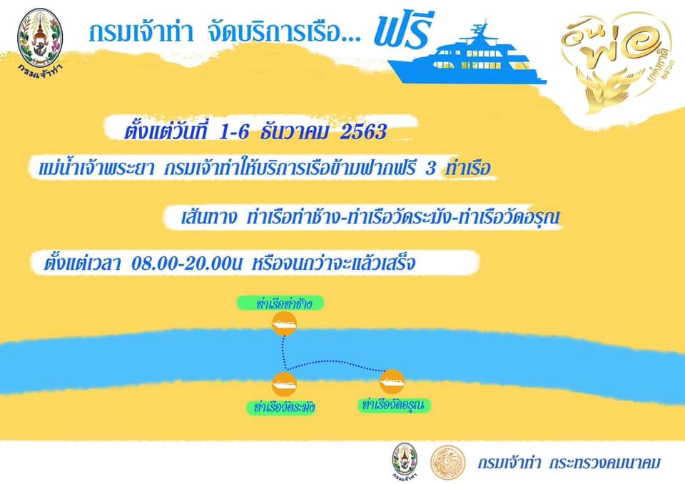 กรมเจ้าท่า จัดเปิดให้ใช้ บริการเรือ ฟรี สองพื้นที่ สองบริการ เนื่องในโอกาส วันพ่อ แห่งชาติ (5 ธ.ค.) โดยเริ่มตั้งแต่วันที่ 1-6 ธันวาคม 2563