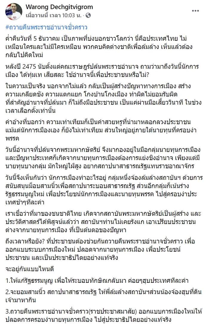 เมื่อวานนี้ (วันที่ 6 ธันวาคม พ.ศ. 2563) นายแพทย์วรงค์ เดชกิจวิกรม (หมอวรงค์) แกนนำกลุ่มไทยภักดี ได้มีการโพสต์ข้อความไว้บนเพจเฟซบุ๊ก Warong Dechgitvigrom ไว้โดยมีใจความประมาณว่า สถาบัน ไม่เคยมีการรังแกหรือเอาเปรียบประชาชน คนไทย ถึงเวลาหรือยังที่จะทำการถวาย พระราชอำนาจ คืนเป็นการชั่วคราว เพื่อออกแบบระบบการเมืองใหม่ ให้ปราศจากการควบคุม เพื่อประโยชน์แก่ประชาชน และเป็นประชาธิปไตยอย่างแท้จริง