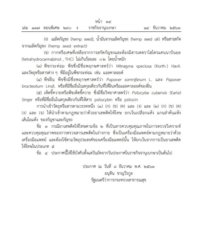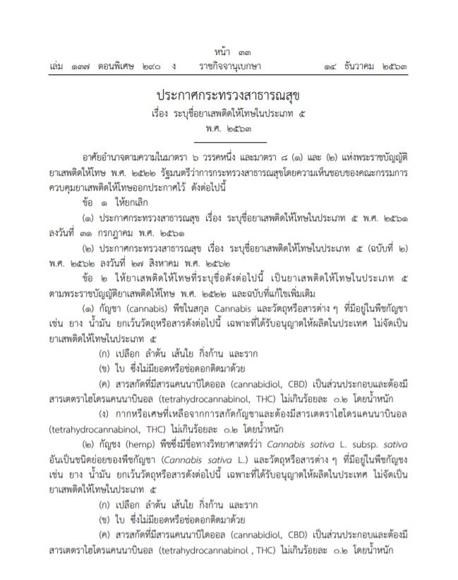 เว็บไซต์ราชกิจจานุเบกษาได้มีการเผยแพร่ประกาศกระทรวงสาธารณสุข (สธ.) โดยได้ถือให้ กัญชา และพืชที่ถือว่าเป็นสารเสพติดอีก 4 ชนิดนั้นถูกเลิกจากการเป็น ยาเสพติด ประเภท 5 ซึ่งนับให้มีผลตั้งแต่ 15 ธันวาคม 2563 เป็นต้นไป