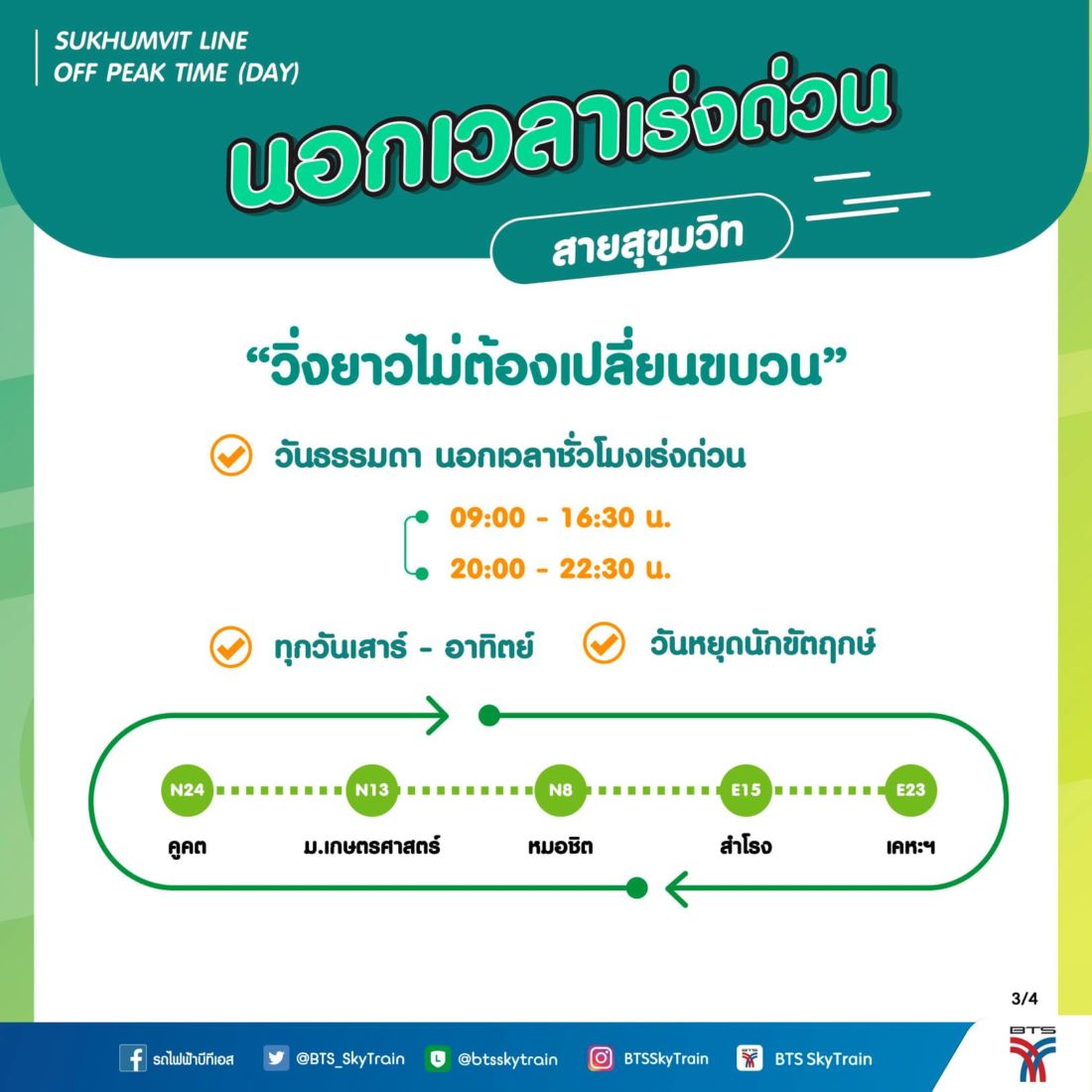 - ช่วงนอกเวลาเร่งด่วนในวันจันทร์-ศุกร์ รวมวันเสาร์-อาทิตย์ วันหยุดนักขัตฤกษ์ รถไฟฟ้าบีทีเอสจะวิ่งยาวทุกขบวน