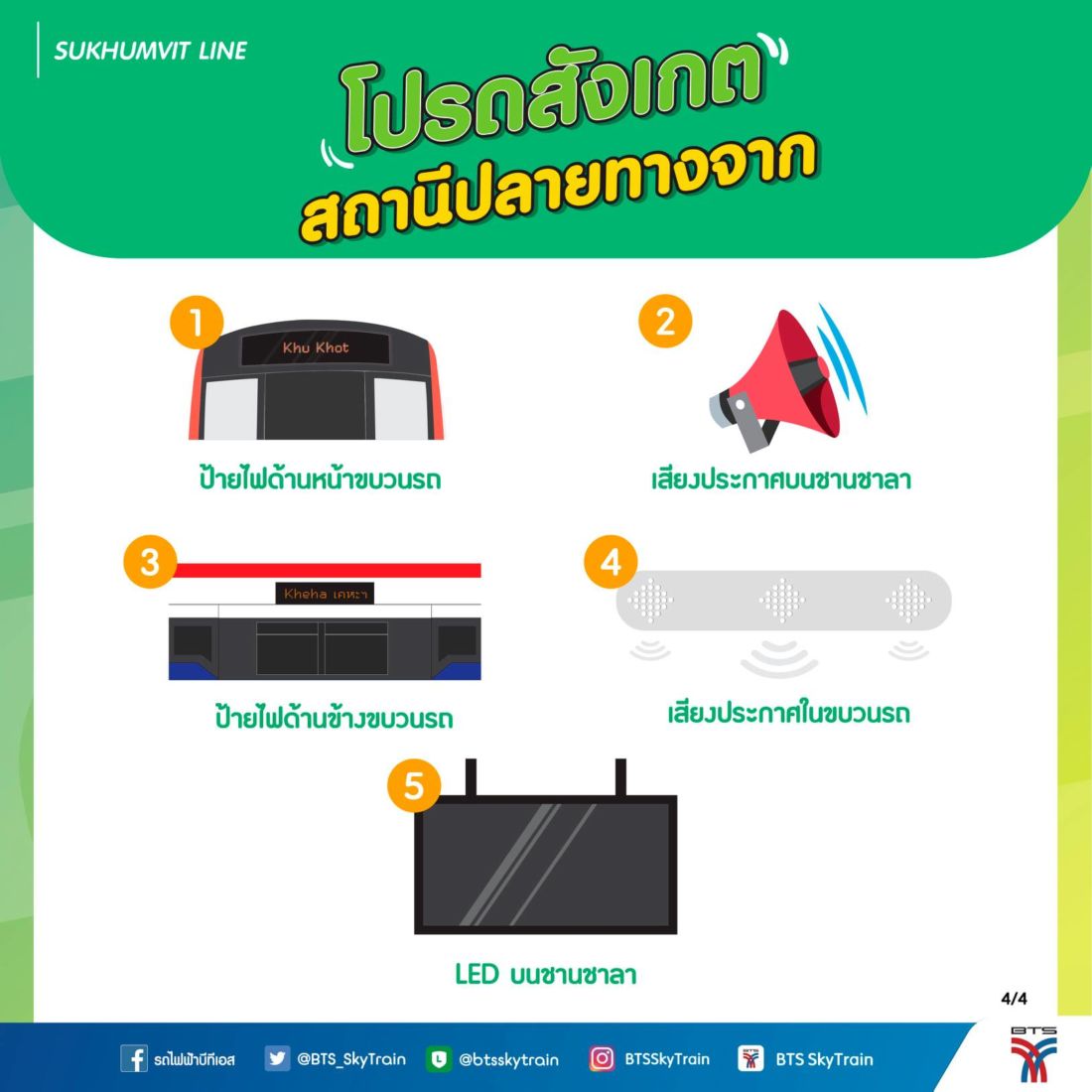 - ขบวนรถวิ่งสั้น ผู้โดยสารที่ประสงค์จะเดินทางไปสถานีเคหะฯ และสถานีคูคต กรุณาเปลี่ยนขบวนรถที่สถานีสำโรง และสถานีหมอชิต (เพื่อรองรับผู้โดยสารในสถานีหลักให้สามารถเดินทางได้อย่างสะดวก และเพื่อรักษาความถี่ในการเดินรถ)