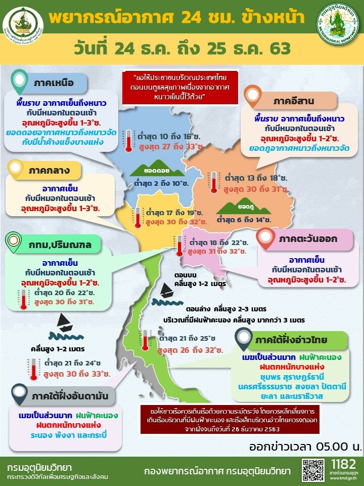 พยากรณ์อากาศ 24 ธ.ค. 63 ความเย็นเริ่มคลาย ภาคใต้ฝนตก