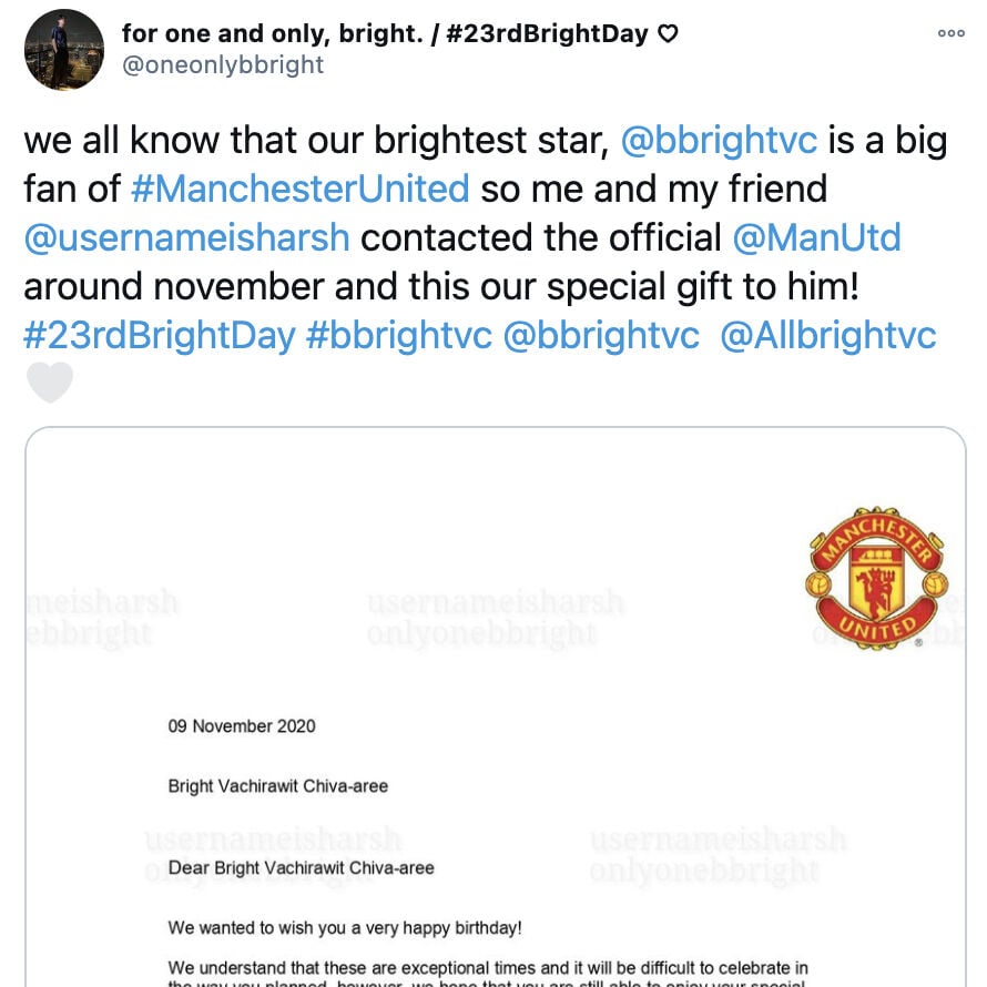 แปลว่า “พวกเราทุกคนรู้ดีว่าดวงดาวที่สว่างที่สุดของพวกเรา, ไบร์ท วชิรวิชญ์ เป็นแฟนตัวยงของสโมสร แมนเชสเตอร์ ยูไนเต็ด ดังนั้น ฉันและเพื่อนของฉันได้ติดต่อไปยังทวิตเตอร์ออฟฟิเชียลของทางสโมสรประมาณเดือนพฤศจิกายน และนี่คือของขวัญสุดพิเศษของพวกเราที่มอบให้แก่เขา!”