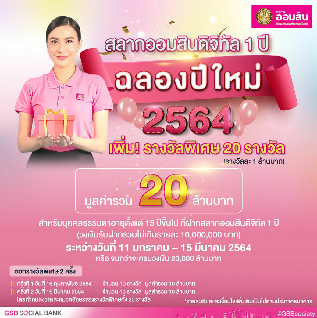ธนาคาร ออมสิน แจก ของขวัญ พิเศษรับปีใหม่ 2564 เพิ่มรางวัล สลากออมสิน ประเภทดิจิทัล 1 ปี อีก 20 ล้านบาท