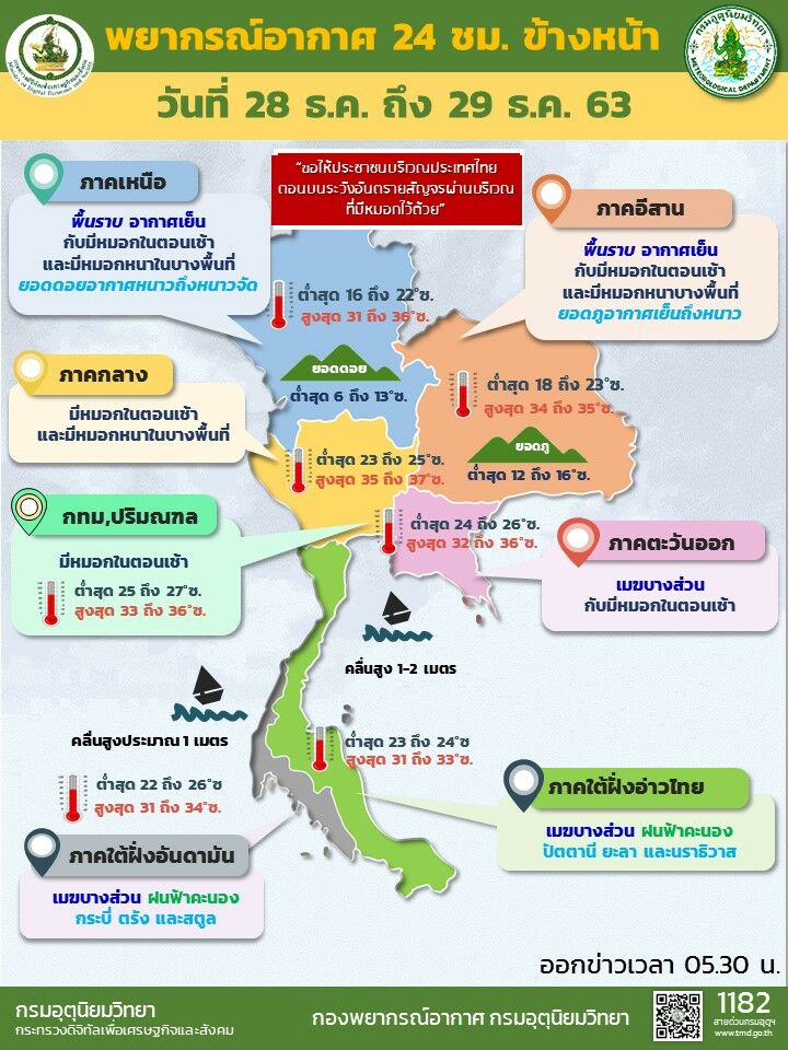พยากรณ์อากาศ 28 ธ.ค. 63 – กรมอุตุนิยมวิทยา รายงานลักษณะอากาศทั่วไป ประจำวันที่ 28 ธันวาคม 2563 พยากรณ์อากาศ 24 ชั่วโมงข้างหน้า บริเวณความกดอากาศสูงหรือมวลอากาศเย็นกำลังอ่อนปกคลุมประเทศไทยตอนบนและทะเลจีนใต้ ทำให้บริเวณดังกล่าวมีหมอกในตอนเช้าและมีหมอกหนาในบางพื้นที่ แต่ยังคงมีอากาศเย็นในภาคเหนือและภาคตะวันออกเฉียงเหนือ ส่วนบริเวณยอดดอยและยอดภูมีอากาศหนาวถึงหนาวจัด ขอให้ประชาชนบริเวณประเทศไทยตอนบนระวังอันตรายในการสัญจรผ่านบริเวณที่มีหมอกหนาไว้ด้วย
