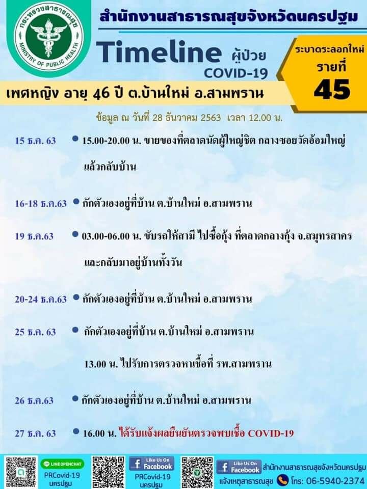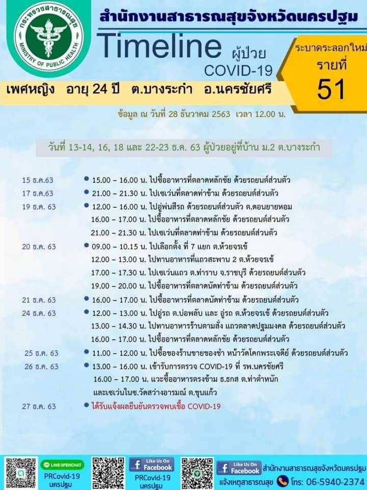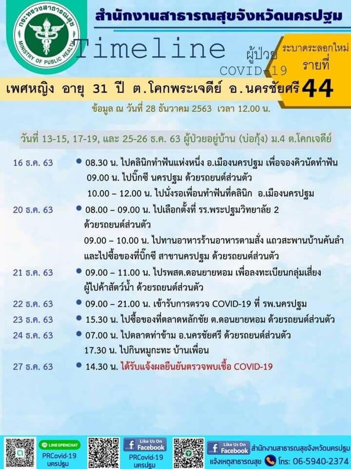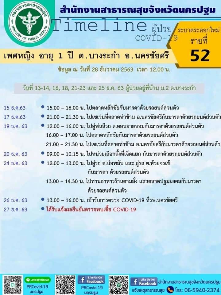 สำนักงานประชาสัมพันธ์จังหวัดนครปฐม ได้เปิดเผยผ่านเฟซบุ๊ก ถึงไทม์ไลน์ของผู้ป่วยโรคโควิด-19 รายที่ 44,45,48,49,50,51,52