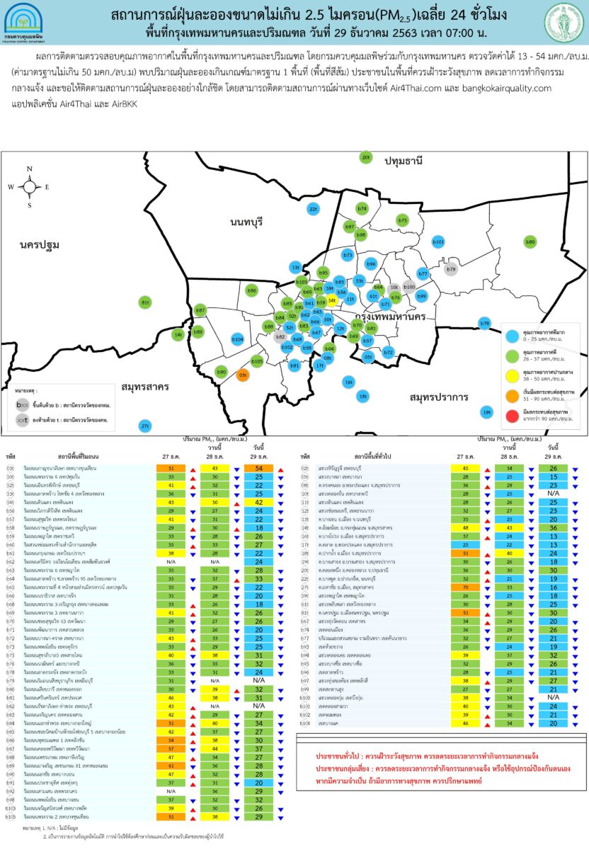 ศูนย์แก้ไขปัญหามลพิษทางอากาศ กรมควบคุมมลพิษ(คพ.) ร่วมกับกรุงเทพมหานคร รายงานผลการตรวจสอบฝุ่นละอองขนาดเล็กไม่เกิน 2.5 ไมครอน หรือ PM2.5 ประจำวันที่ 29 ธ.ค. 63 เวลา 07.00 น. ตรวจวัดค่าได้ 13-54 มคก./ลบ.ม. โดยมี 1 พื้นที่ในเขต กรุงเทพและปริมณฑล ที่ PM2.5 เกินค่ามาตรฐาน 50 มคก./ลบ.ม. คือ ริมถนนกาญจนาภิเษก เขตบางขุนเทียน ที่วัดได้ 54 มคก./ลบ.ม.