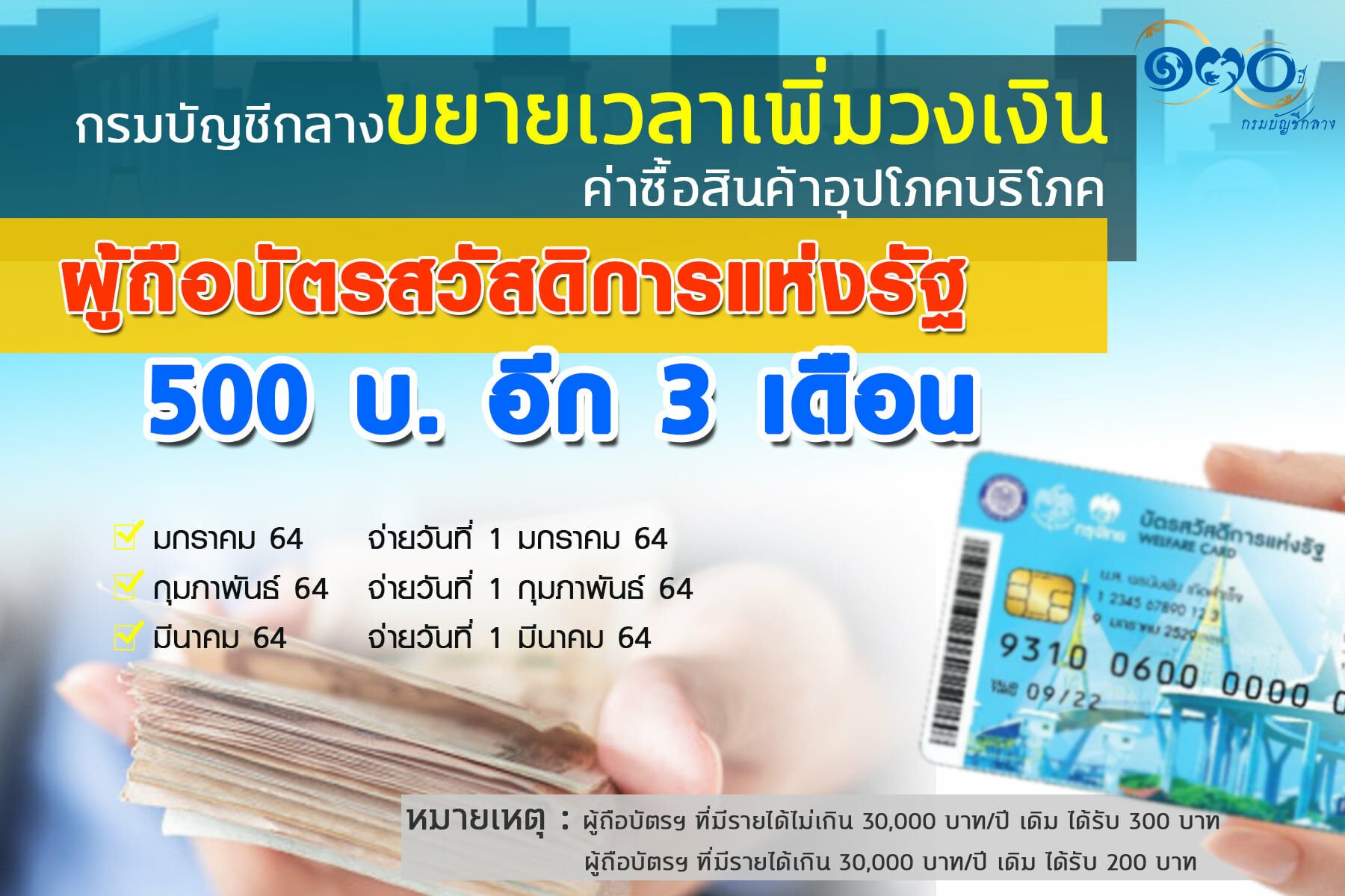 กรมบัญชีกลางเพิ่มวงเงิน 500 บาท ต่อเนื่อง 3 เดือน (ม.ค.-มี.ค.64) ให้ผู้ถือบัตรคนจน บัตรสวัสดิการแห่งรัฐ เพื่อช่วยเหลือค่าใช้จ่ายสินค้าอุปโภคบริโภคให้แก่ผู้มีรายได้น้อย