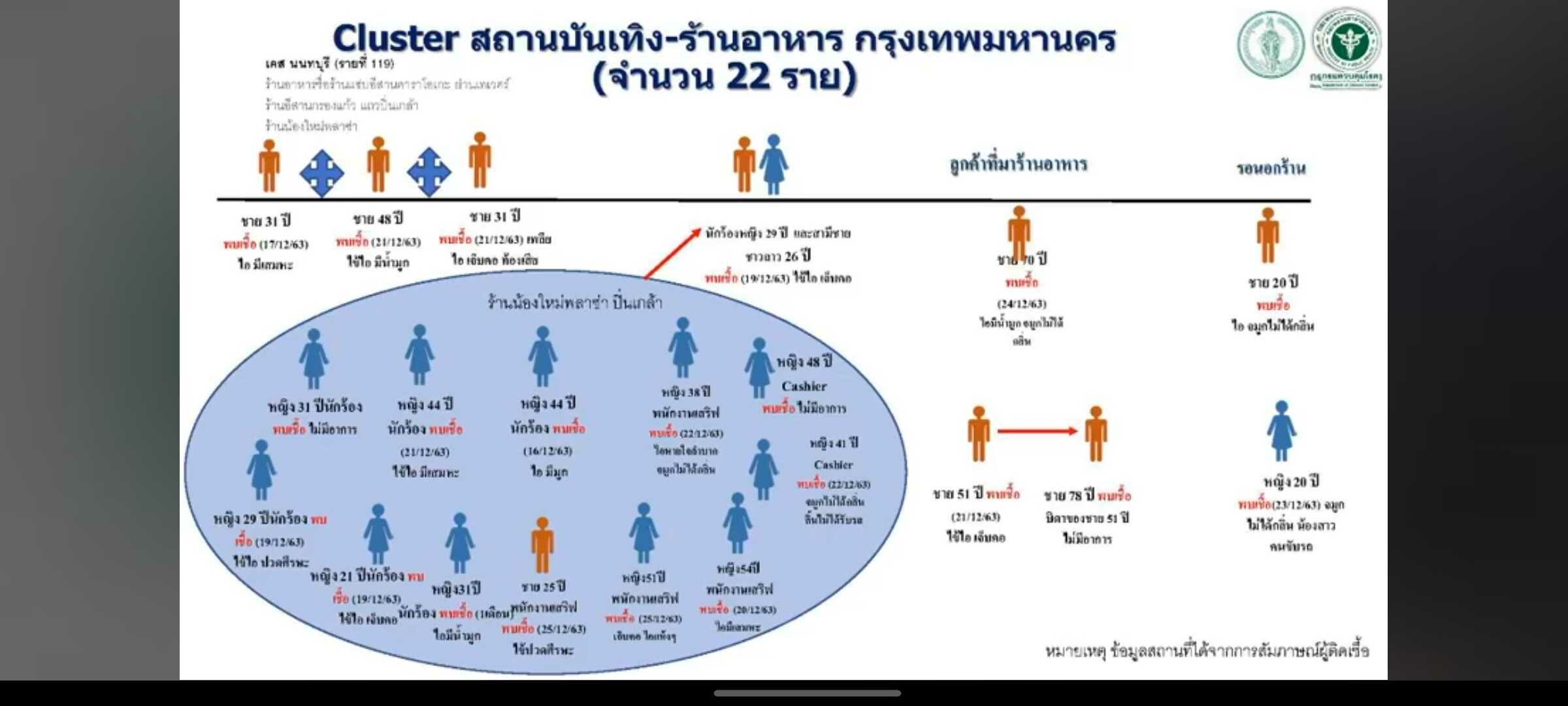 ผอ.สถาบันป้องกันควบคุมโรคเขตเมือง ได้ออกมาร้องขอให้ประชาชนเดินทางไปร้านอาหารหรือผับ ย่านปิ่นเกล้า – เทเวศร์ ในช่วง 15 – 20 ธ.ค. ให้เฝ้าสังเกตอาการ หลังพบ ผู้ป่วย โควิด 22 ราย
