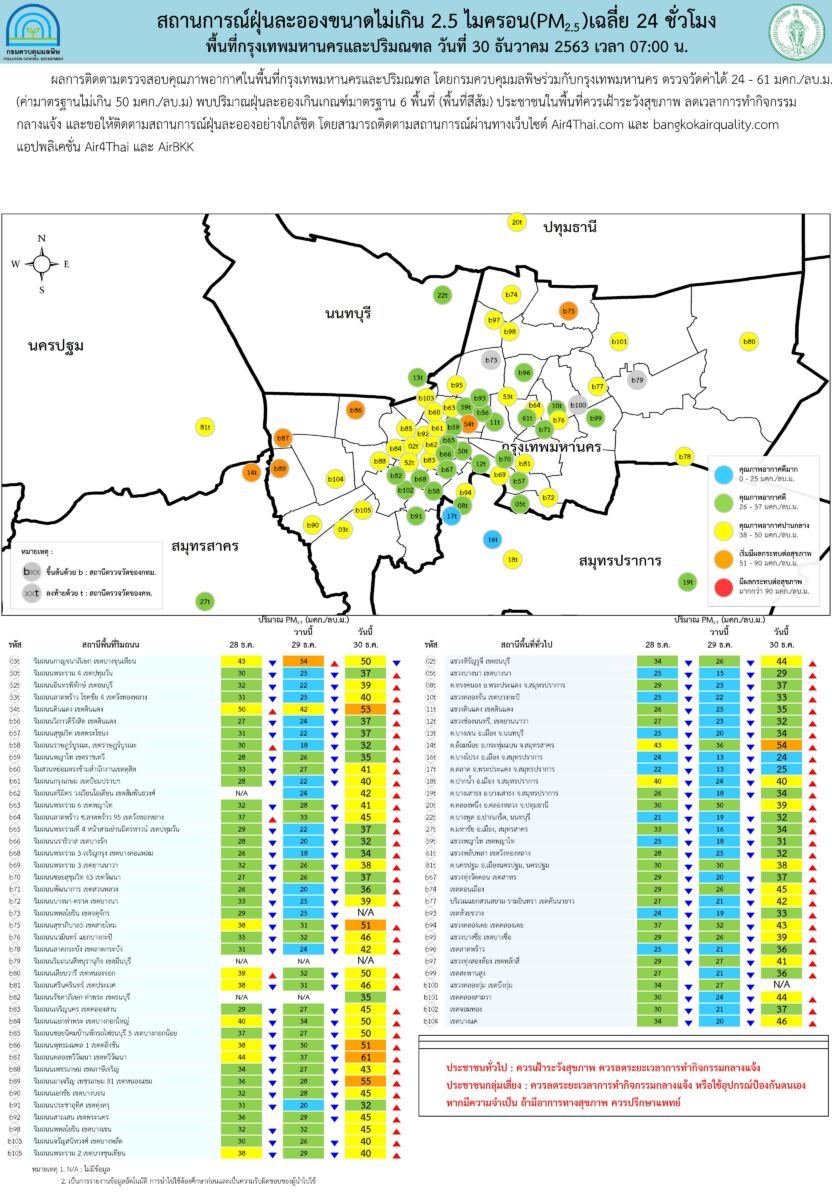 ศูนย์แก้ไขปัญหามลพิษทางอากาศ กรมควบคุมมลพิษ(คพ.) ร่วมกับกรุงเทพมหานคร รายงานผลการตรวจสอบฝุ่นละอองขนาดเล็กไม่เกิน 2.5 ไมครอน หรือ PM2.5 ประจำวันที่ 30 ธ.ค. 63 เวลา 07.00 น. ตรวจวัดค่าได้ 24-61 มคก./ลบ.ม. โดยมี 6 พื้นที่ในเขต กรุงเทพและปริมณฑล ที่ PM2.5 เกินค่ามาตรฐาน 50 มคก./ลบ.ม.