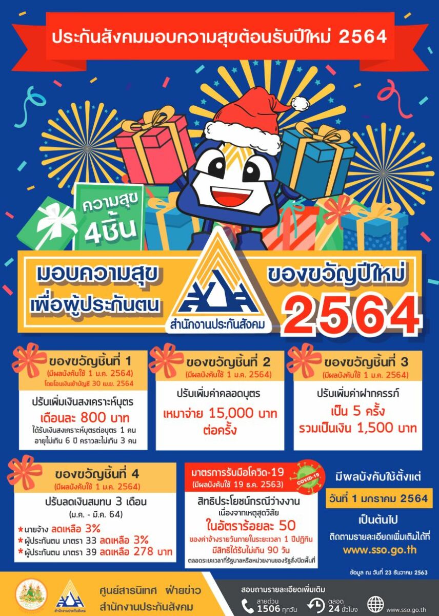 สำนักงานประกันสังคม กระทรวงแรงงาน ได้ทำการมอบ ของขวัญปีใหม่ 2564 ให้แก่บรรดา ผู้ประกันตน ภายในระบบกองทุนทั้งในส่วนของตาม มาตรา 33 และมาตรา 39