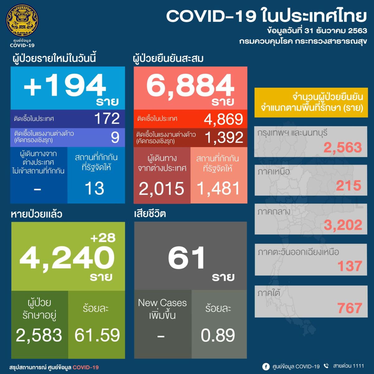 โควิด-19 ไทย 31 ธ.ค. 63 พบผู้ป่วยเพิ่ม 194 ราย