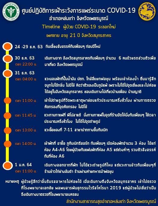 ศูนย์ปฎิบัติการเฝ้าระวังการแพร่ระบาดโควิด-19 อำเภอหล่มเก่า จังหวัดเพชรบูรณ์ ได้เปิดเผยไทม์ไลน์ ผู้ป่วยโควิด-19 รายใหม่ เป็นเพศชายอายุ 21 ปี ชาวจังหวัดสมุทรสาคร ซึ่งจากการตรวจสอบไทม์ไลน์พบว่าเขาและเพื่อนอีก 6 คน ได้เดินทางเที่ยวเขาค้อ-ภูทับเบิก ในปีใหม่ที่ผ่านมา