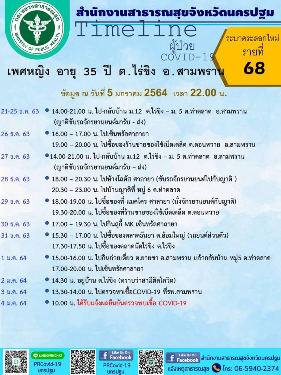 สำนักงานสาธารณสุขจังหวัด นครปฐม เปิดเผย ไทม์ไลน์ ผู้ป่วยโควิด-19 รายที่ 67-68 ระบาดระลอกใหม่ โดยมาจาก อ.ดอนตูม และ อ.สามพราน