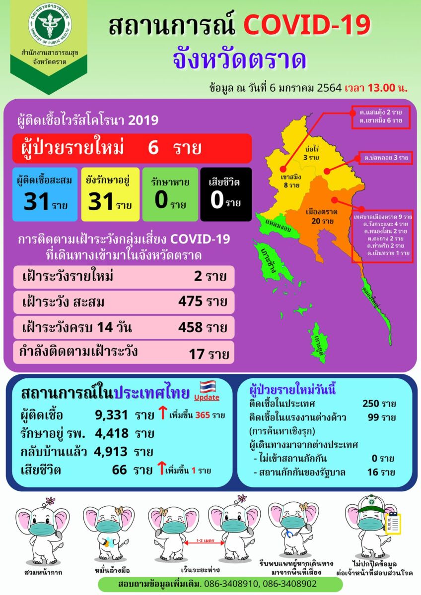 6 ม.ค. 64 ตราด พบ ผู้ป่วยโควิด-19 เพิ่ม 6 ราย