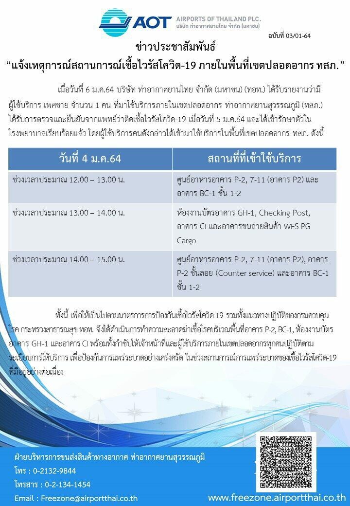 อากาศยานไทย จำกัด (มหาชน) (ทอท.) ได้แจ้งข่าว “แจ้งเหตุการณ์สถานการณ์เชื้อไวรัสโควิด-19 ภายในพื้นที่เขตปลอดอากร ทสภ. หลังจากที่มีรายงานว่าพบว่ามีผู้ใช้บริการที่เขตปลอดอากรของท่าอากาศยานสุวรรณภูมิป่วยเป็นโรคโควิด-19 เมื่อวันที่ 5 มกราคม 2564 ที่ผ่านมา