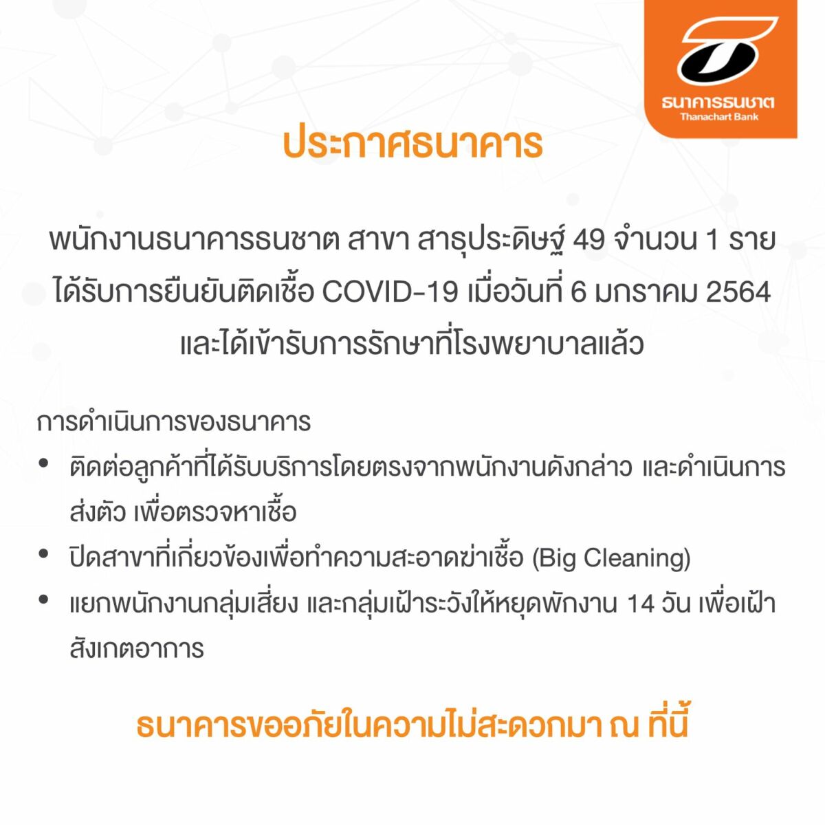 ธนาคารธนชาต เผยแพร่ประกาศธนาคารแจ้งว่า มีพนักงานธนาคารธนชาต สาขา สาธุประดิษฐ์ 49 จำนวน 1 ราย ได้รับการยืนยันผลตรวจจากโรงพยาบาลเมื่อวันที่ 6 มกราคม 2564 ว่าติดเชื้อ โควิด-19