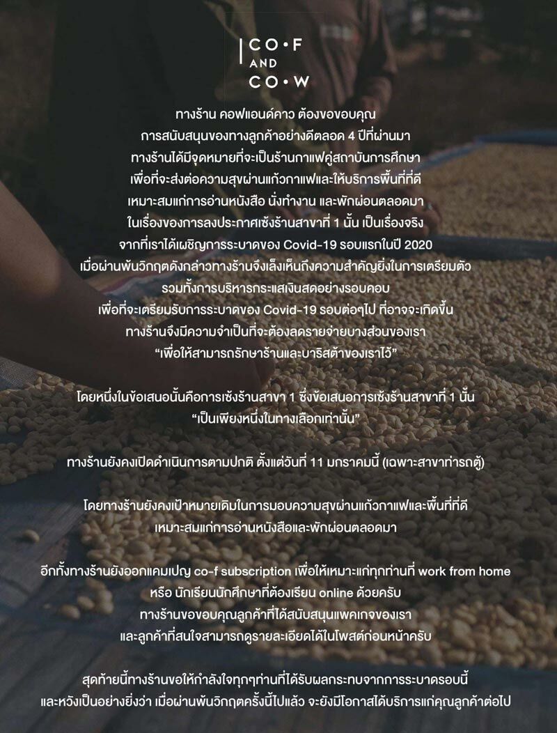 CO-F & CO-W ร้านกาแฟชื่อดังขวัญใจเด็กธรรมศาสตร์ รังสิต ประกาศเซ้งสาขา U VILLAGE เนื่องจากได้รับผลกระทบจากโควิด-19