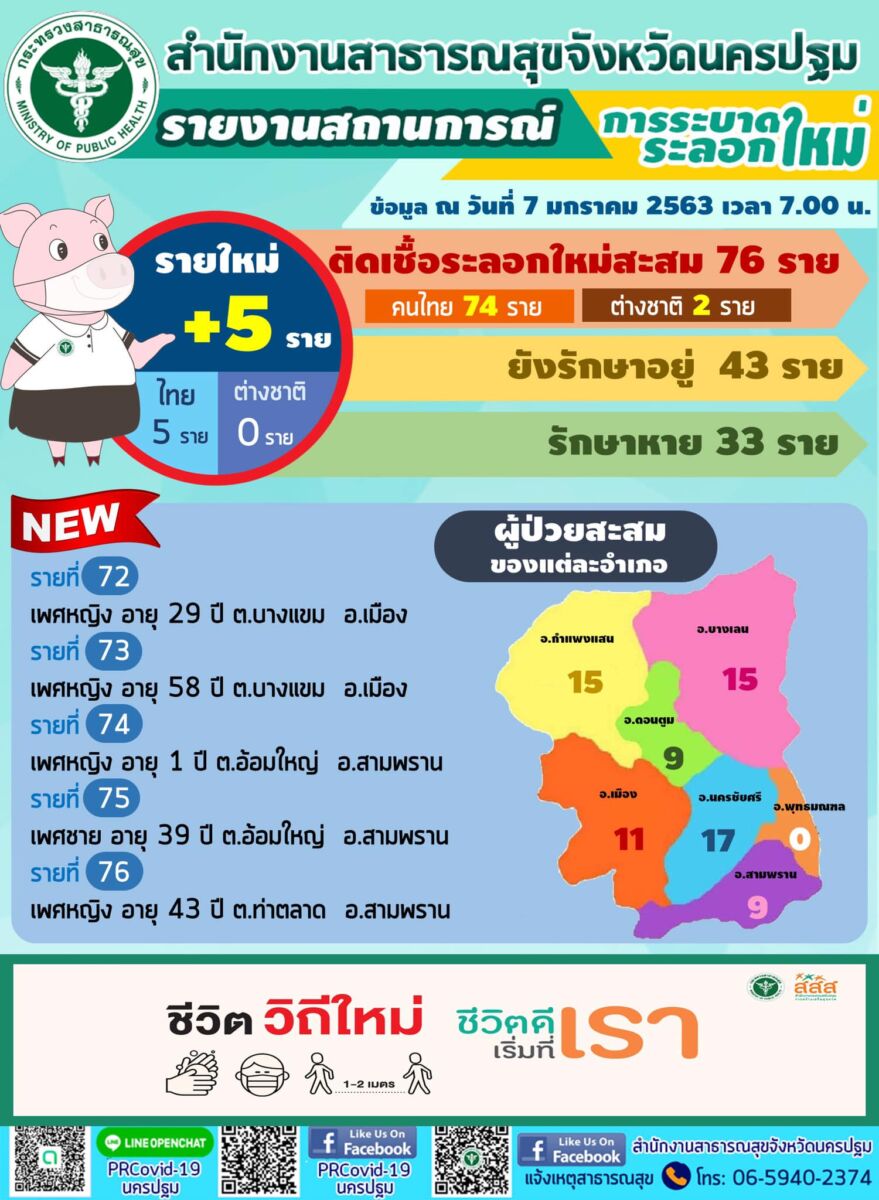 7 ม.ค. 64 นครปฐม พบ ผู้ป่วยโควิด-19 เพิ่ม 5 ราย