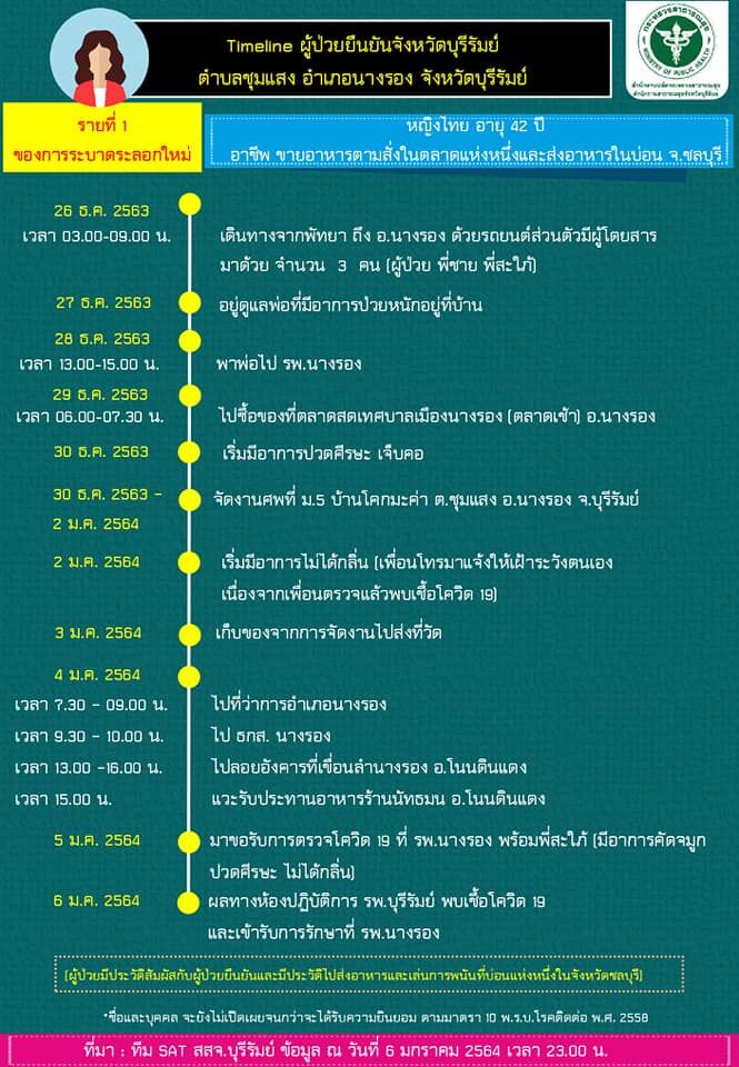สำนักงานสาธารณสุขจังหวัด บุรีรัมย์ เปิดเผย ไทม์ไลน์ ผู้ป่วยโควิด-19 รายแรกในรอบ 280 วัน ซึ่งเป็นหญิงไทย อายุ 42 ปี ประกอบอาชีพ ขายอาหารตามสั่งและส่งอาหารในบ่อนพัทยา