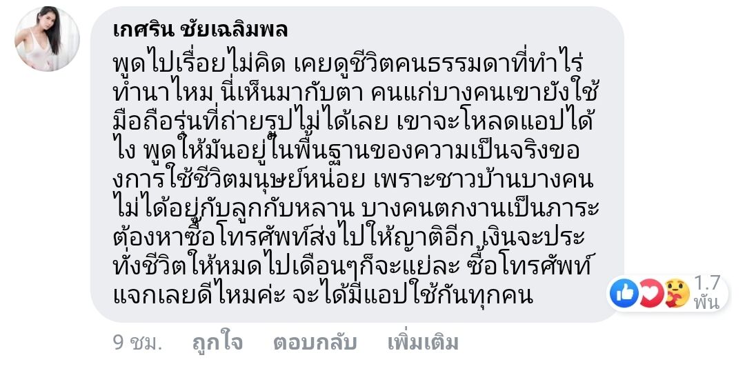 “พูดไปเรื่อยไม่คิด เคยดูชีวิตคนธรรมดาที่ทำไร่ทำนาไหม นี่เห็นมากับตา คนแก่บางคนเขายังใช้มือถือรุ่นที่ถ่ายรูปไม่ได้เลย เขาจะโหลดแอปได้ไง พูดให้มันอยู่ในพื้นฐานความเป็นจริงของการใช้ชีวิตมนุษย์หน่อย เพราะชาวบ้านบางคนไม่ได้อยู่กับลูกหลาน บางคนตกงานเป็นภาระ ต้องหาซื้อโทรศัพท์ส่งไปให้ญาติอีก เงินจะประทังชีวิตให้หมดไปเดือน ๆ ก็จะแย่ละ ซื้อโทรศัพท์แจกเลยดีไหมค่ะ จะได้มีแอปใช้กันทุกคน”