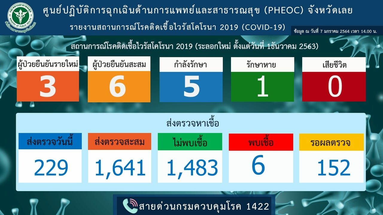8 ม.ค. 64 เลย พบ ผู้ป่วยโควิด-19 เพิ่ม 3 ราย