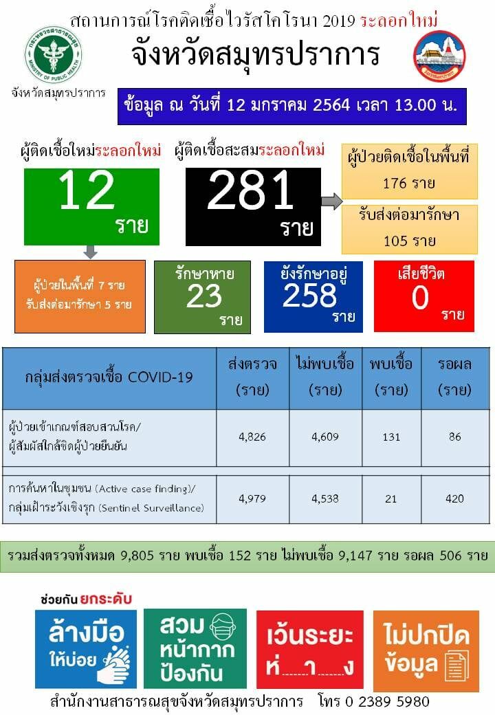 12 ม.ค. 64 สมุทรปราการ พบ ผู้ป่วยโควิด-19 เพิ่ม 12 ราย