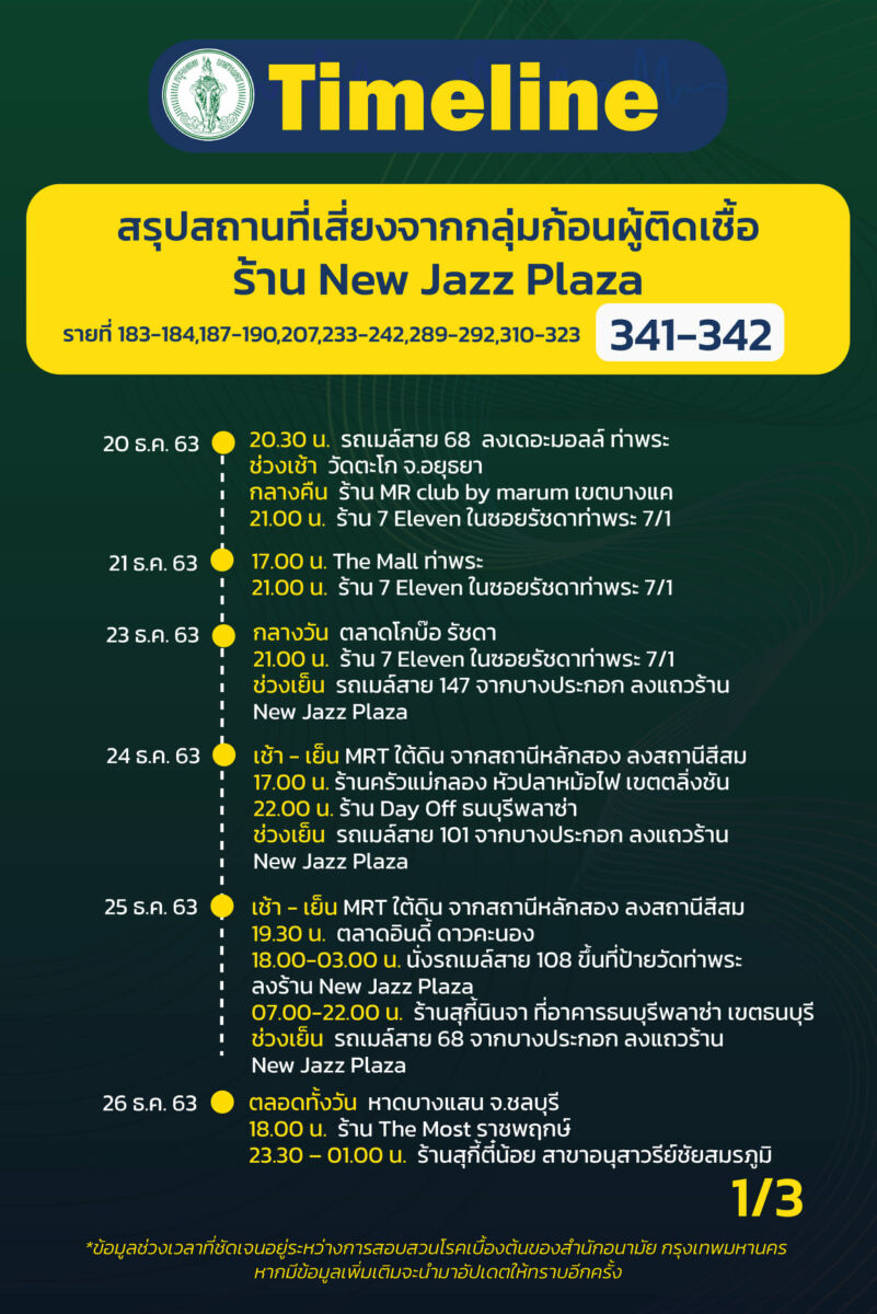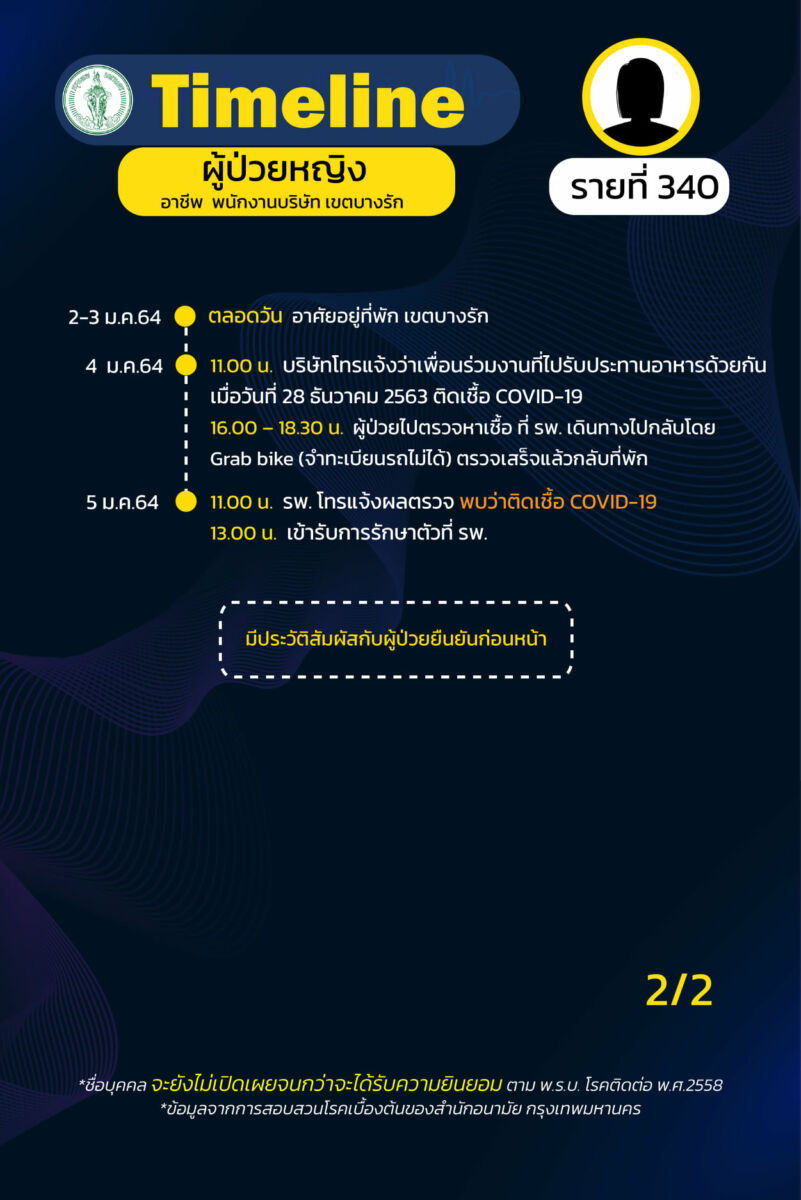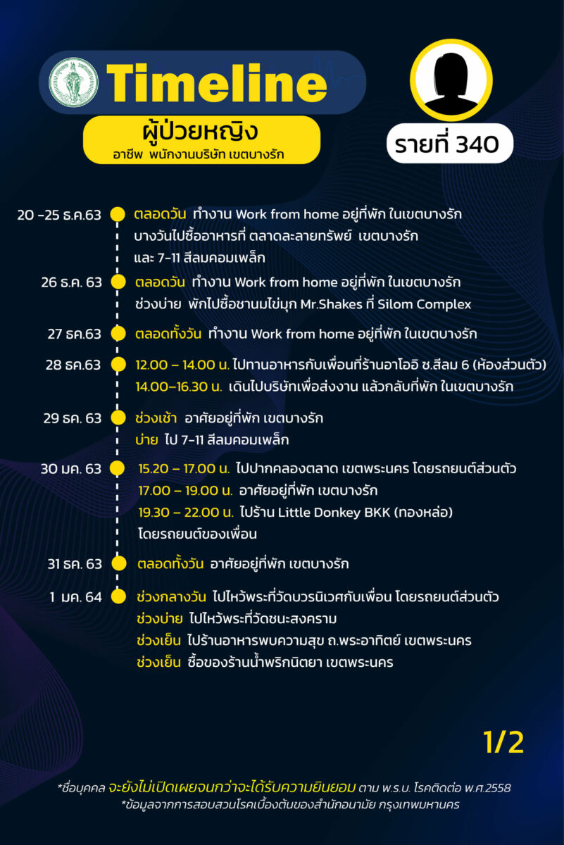 ร.ต.อ.พงศกร ขวัญเมือง โฆษกกรุงเทพมหานคร อัพเดตสถานการณ์การระบาดของโควิด-19 ใน กรุงเทพ โดยเปิดเผย ไทม์ไลน์ ผู้ป่วยโควิด-19 รายที่ 324-342 ระบาดระลอกใหม่ และพบว่าผู้ป่วยส่วนใหญ่เป็นพนักงานบริษัท