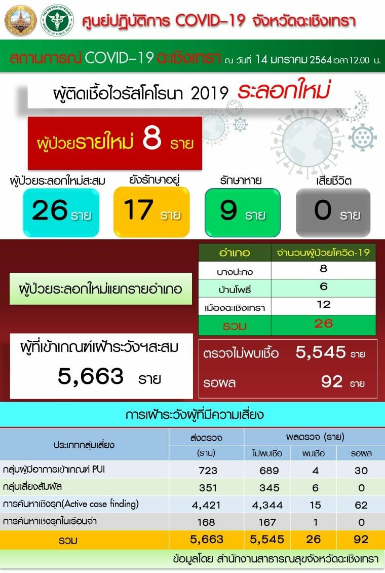 14 ม.ค. 64 ฉะเชิงเทรา พบ ผู้ป่วยโควิด-19 เพิ่ม 8 ราย