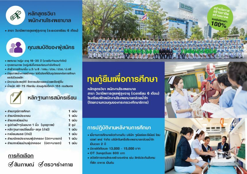 ซึ่งเมื่อจบการศึกษาหลักสูตรนี้แล้วจะได้ทำงานดูแลผู้ป่วย ผู้สูงอายุ กับบริษัท จูเนียร์ และซีเนียร์ โฮมเฮลท์แคร์ จำกัด ซึ่งเป็นหนึ่งบริษัทในเครือโรงพยาบาลกล้วยน้ำไท เป็นระยะเวลา 2 ปี โดยไม่ต้องคืนทุน แถมมีรายได้ 13,000-15,000 บาท รวมถึงค่าทำงานล่วงเวลาหรือโอที วันละ 800 บาท หลังจากที่ทำงานครบ 2 ปี ก็สามารถไปทำงานที่อื่นได้ตามต้องการ