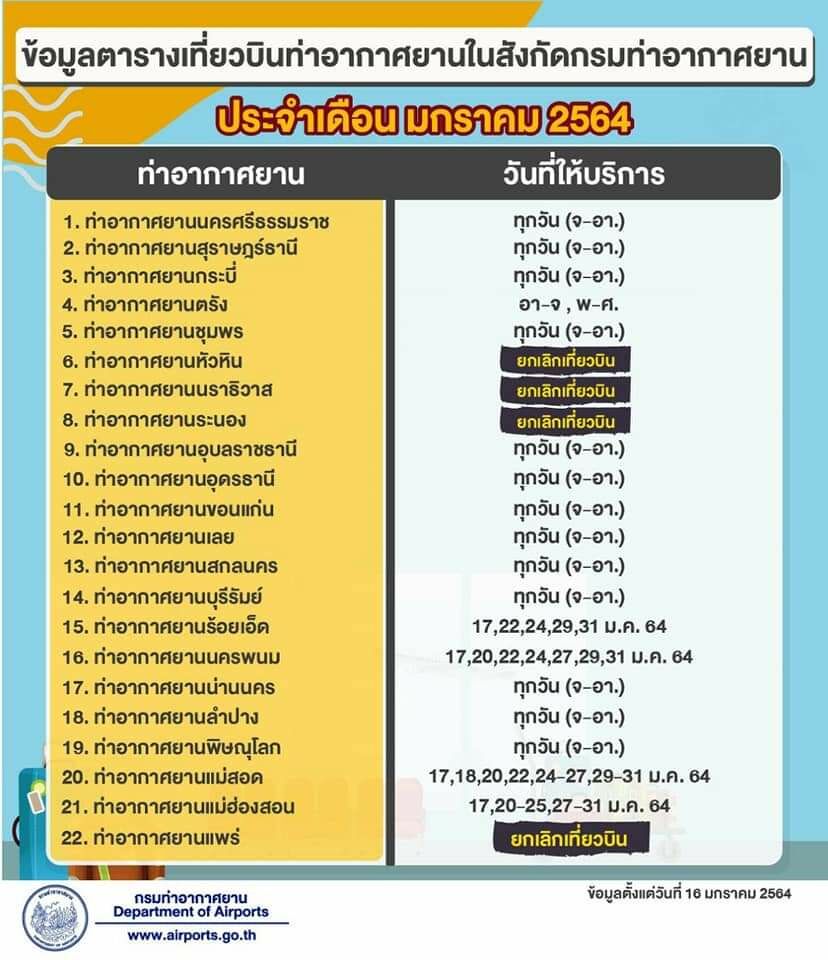 ด้วยเหตุนี้ทำให้ วันที่ 15-31 ม.ค. 64 ท่าอากาศยานระนอง และท่าอากาศยานแพร่ จะถูกยกเลิกเที่ยวบินและไม่มีการทำการบิน ในขณะที่ท่าอากาศยานนราธิวาส จะถูกยกเลิกเที่ยวบินและไม่มีการทำการบินเช่นเดียวกัน โดยเริ่มตั้งแต่วันที่ 18-31 ม.ค. 64