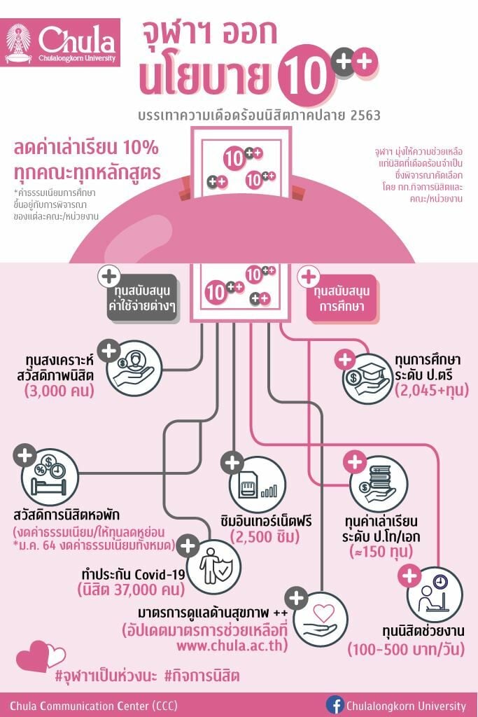 เพจเฟซบุ๊กของ จุฬาลงกรณ์มหาวิทยาลัย ได้ออกมาโพสต์ข้อความถึง นโยบาย 10 พลัส พลัส เพื่อบรรเทาความเดือนร้อนของนิสิต ภาคปลาย 2563 โดยนโยบายดังกล่าวจะ ลดค่าเล่าเรียน 10% ทุกคณะทุกหลักสูตร