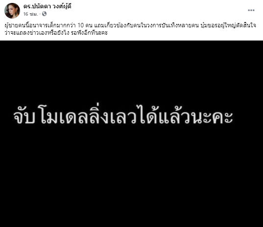 เมื่อวานนี้ (19 ม.ค.) พิธีกรชื่อดัง บุ๋ม ปนัดดา วงศ์ผู้ดี ได้ออกมาโพสต์แฉผ่านทางเฟซบุ๊กแฟนเพจว่า มีโมเดลลิ่งชายคนหนึ่ง กระทำอนาจารเด็กมามากกว่า 10 คน แถมยังเกี่ยวข้องกับบุคคลในวงการบันเทิงหลายคน พร้อมทั้งเผยว่า จับโมเดลลิ่งคนดังกล่าวได้แล้ว โดยระบุว่า