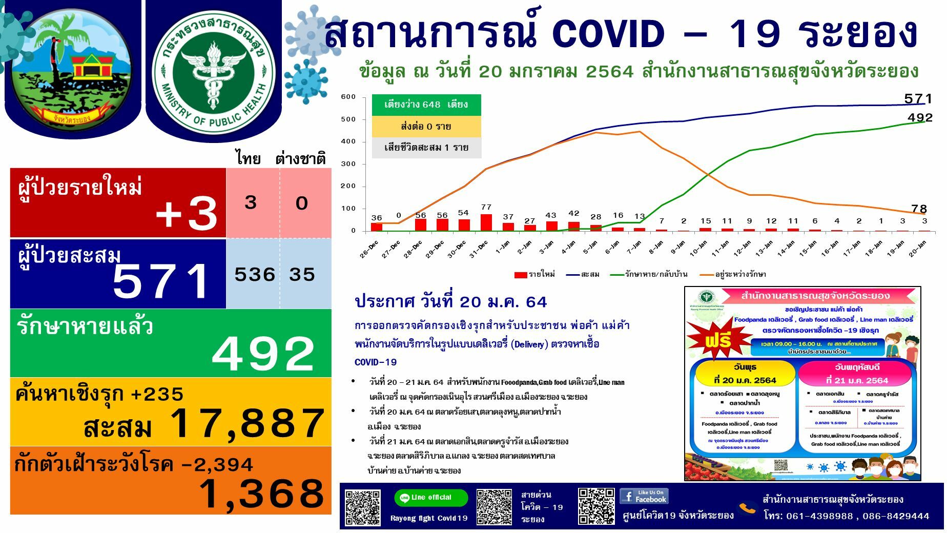 20 ม.ค. 64 ระยอง พบ ผู้ป่วยโควิด-19 เพิ่ม 3 ราย