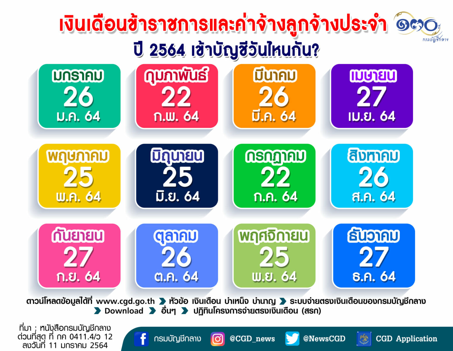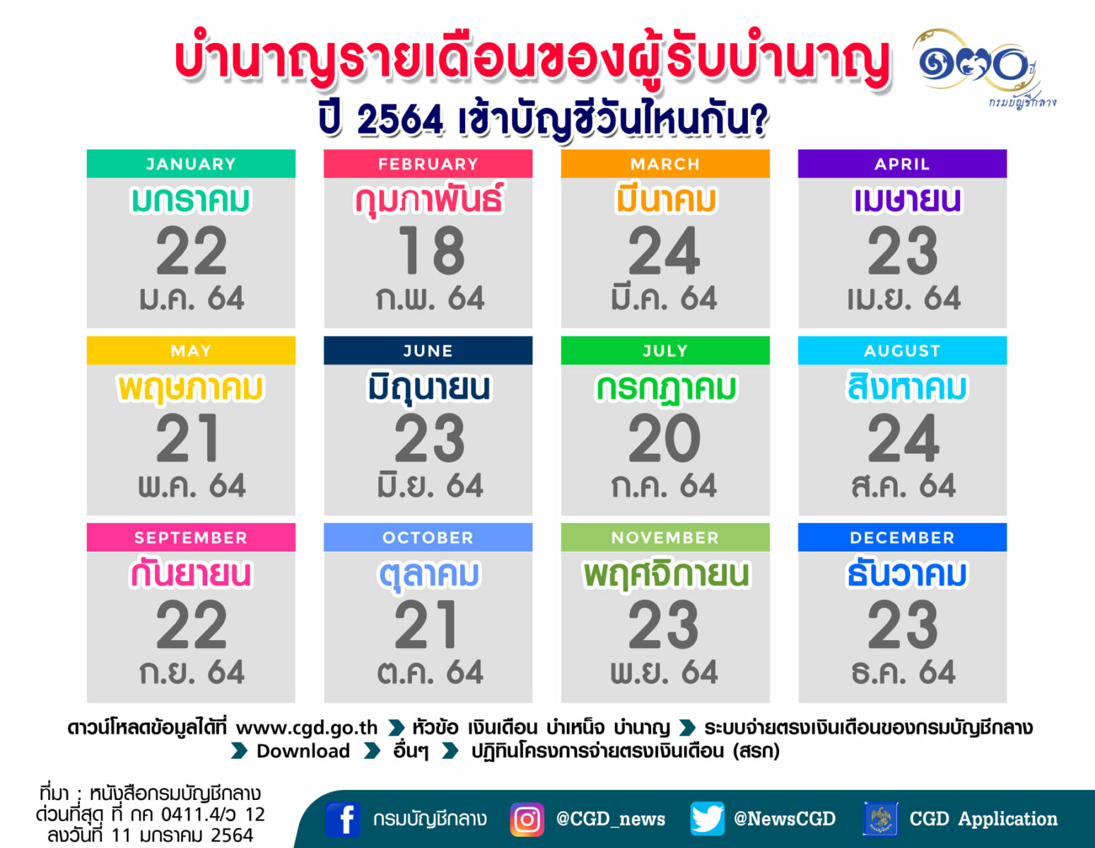 ปฏิทินจ่ายเงินเดือน 2564 ข้าราชการ ลูกจ้างประจำ ผู้รับบำนาญ