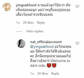ทางด้านแน๊ตเอง ก็ตอบกลับแกมหยอกว่า “@yingsakfood อะไรนะคุณแม่ นี่มันกำลังได้ฟิวส์เลยนะคะ อีกนิดหนูจะพาคุณแม่ไปถึงดาวอังคาร Welcome to dark side..”