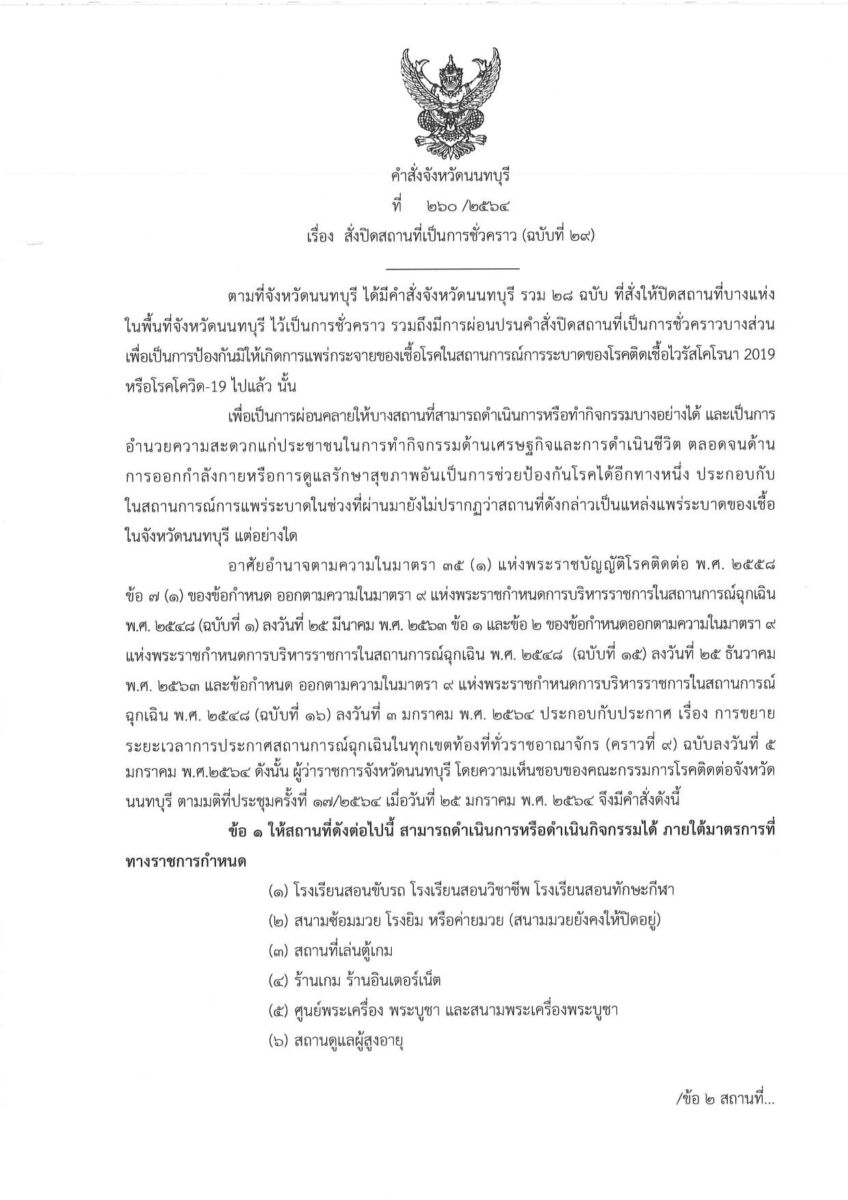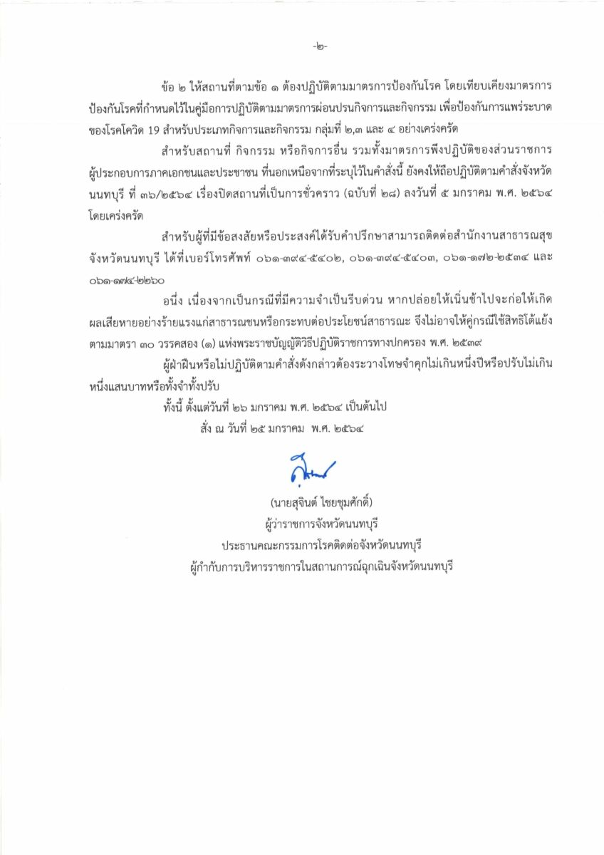 วานนี้ (25 ม.ค.) นายสุจินต์ ไชยชุมศักดิ์ ผู้ว่าราชการจังหวัด นนทบุรี ในฐานะประธานคณะกรรมการโรคติดต่อจังหวัดนนทบุรี ผู้กำกับการบริหารราชการในสถานการณ์ฉุกเฉินจังหวัดนนทบุรี ออกคำสั่งจังหวัด ที่ 260/2564 ลงวันที่ 25 มกราคม 2564 ให้สถานที่ดังต่อไปนี้ สามารถดำเนินการหรือดำเนินกิจการได้ โดยต้องปฏิบัติตามมาตรการป้องกันโรคอย่างเคร่งครัด